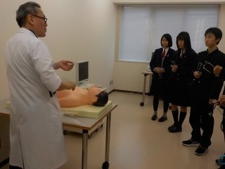 また、実習の合間には大学探検と称し、スキルズラボ・実験実習支援センター・附属図書館を訪問しました。スキルズラボでは、臨床教育講座の伊藤教授、辻准教授から「呼吸音聴診トレーニングシステム(ラング)」の使用方法について指導を受け、続いて実験実習支援センターでは電子顕微鏡を使ったミクロの世界を体験し、附属図書館では医学部ならではの蔵書が多く並ぶ書庫を見学しました。