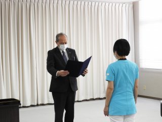 令和3年2月16日、本学管理棟中会議室において、大阪コロナ重症センターでの業務に従事した本学医学部附属病院の看護師2名に対して、滋賀医科大学表彰の表彰式を執り行いました。