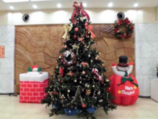 今年も、病院・大学職員が力を合わせて設営致しました。正面玄関前の池に投影される灯りの様子は、今年最後の情景です。病院玄関ホールの陶板前に設置された大きなクリスマスツリーや、外来棟2階の憩いの広場の飾りも例年どおりお楽しみ頂けます。12月25日まで、多くの皆さんの癒やしになれば幸いです。